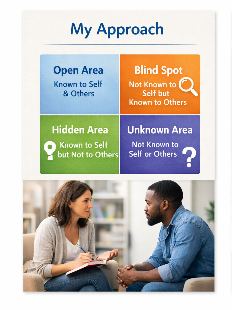My goal when someone comes to counseling is to help them find solutions to the challenges that may be keeping them from living their fullest life. I take a holistic approach, working collaboratively to identify the areas of life that will have the greatest impact on reaching their goals. Sometimes this means providing a safe space for therapeutic listening; other times it involves gently challenging long-held beliefs or thought patterns that may no longer serve them. I view my role much like the Johari Window: helping clients uncover the parts of themselves that they may not see, while also exploring the aspects of their life that others notice but they may be unaware of. We also focus on recognizing past successes and core values, which often provide the foundation for growth and meaningful change.